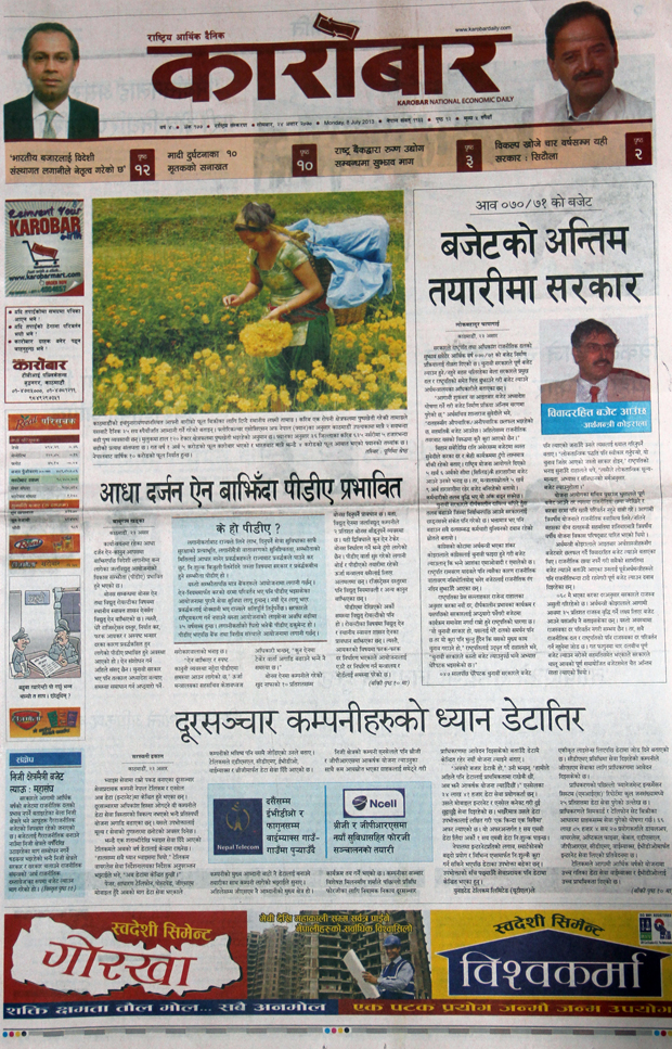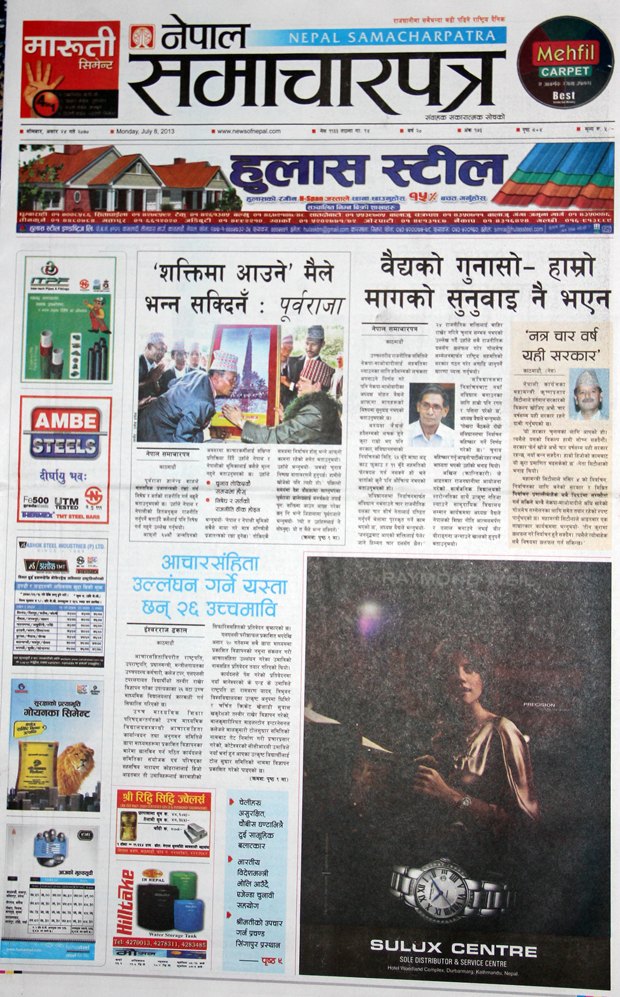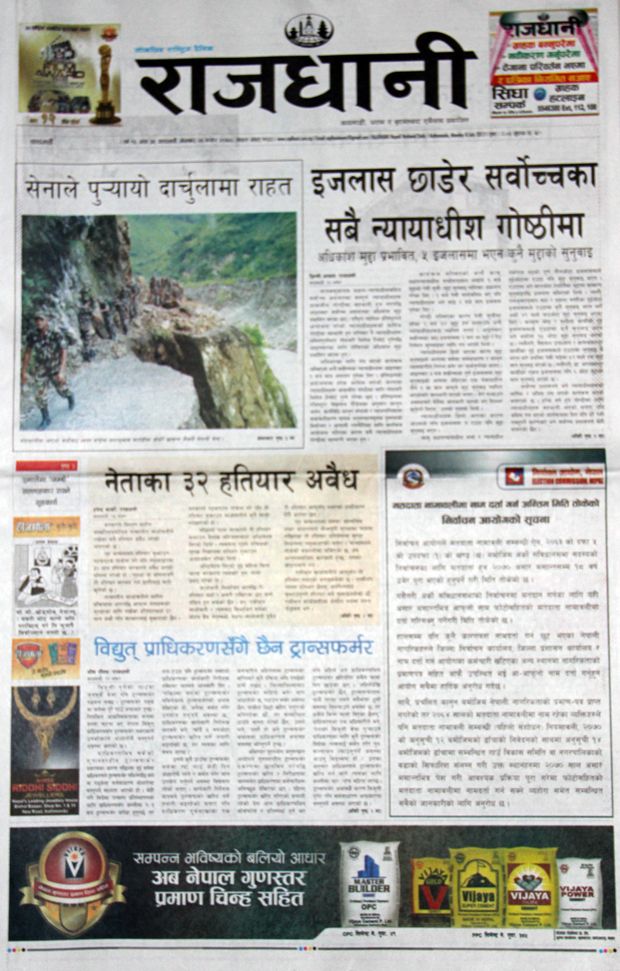 इजलास छाडेर सर्वोच्चका सबै न्यायाधीश गोष्ठीमा पुगेको राजधानी दैनिकमा मुख्य खबर छ भने सेनामा भएको भ्रष्टाचारको खबर अन्नपूर्ण पोष्टले मुख्य रुपमा छापेको छ ।