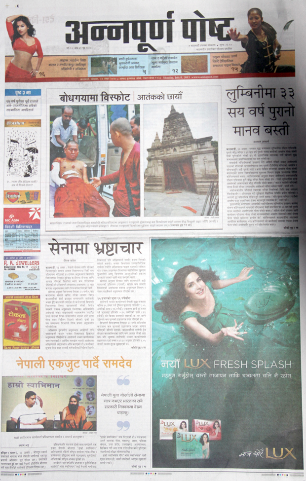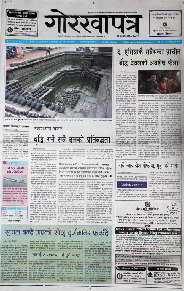 आज मिति २०७० असार २४ गते सोमबार । राजधानीबाट प्रकाशित आजका दैनिक पत्रिकाले दक्षिण एसियाकै सबैभन्दा प्राचीन बौद्ध देवलको अवशेष फेला परेको र बोधगयामा शृङ्खलाबद्ध विस्फोट भएको खबरलाई प्राथमिकताका साथ छापेका छन् ।