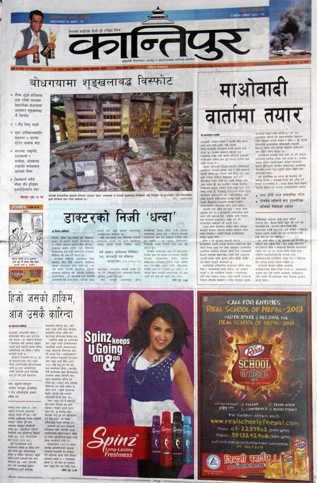 कान्तिपुर दैनिकले नेकपा-माओवादी वार्ता गर्न तयार रहेको खबरलाई मुख्य बनाएको छ भने काँग्रेसका ४२ विभाग बेवारिसे अवस्थामा रहेको खबर नयाँ पत्रिकाले मुख्य रुपमा छापेको छ ।