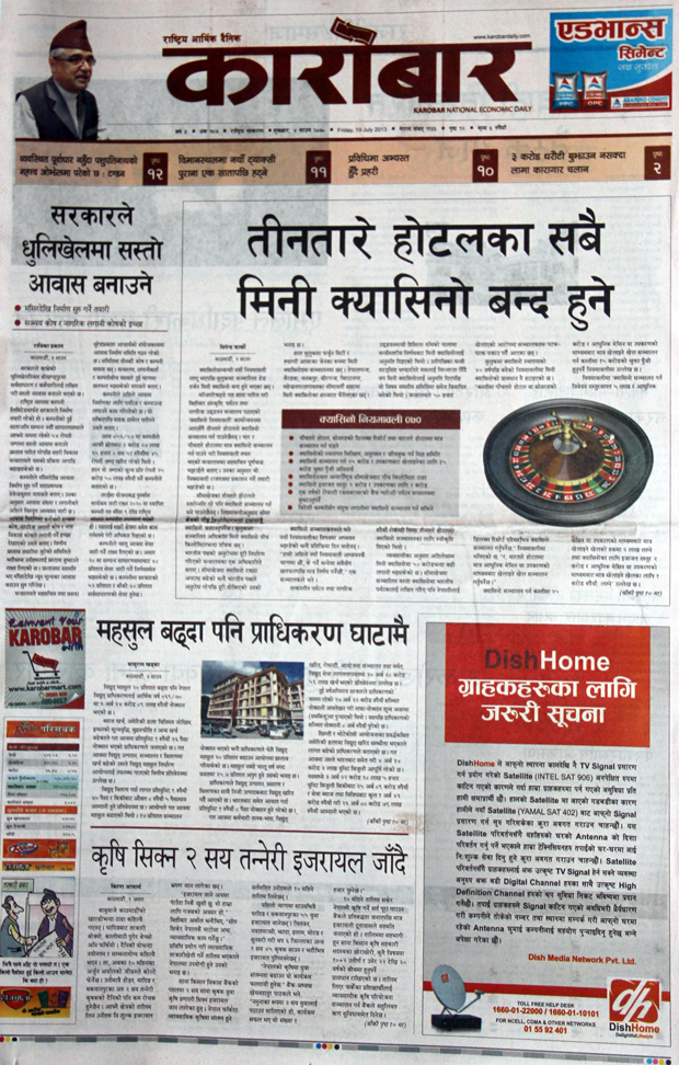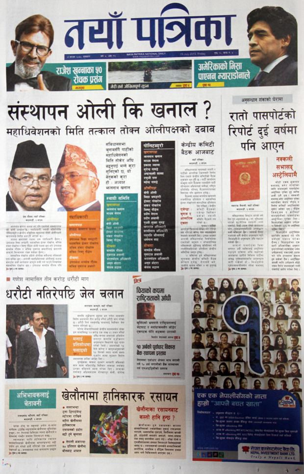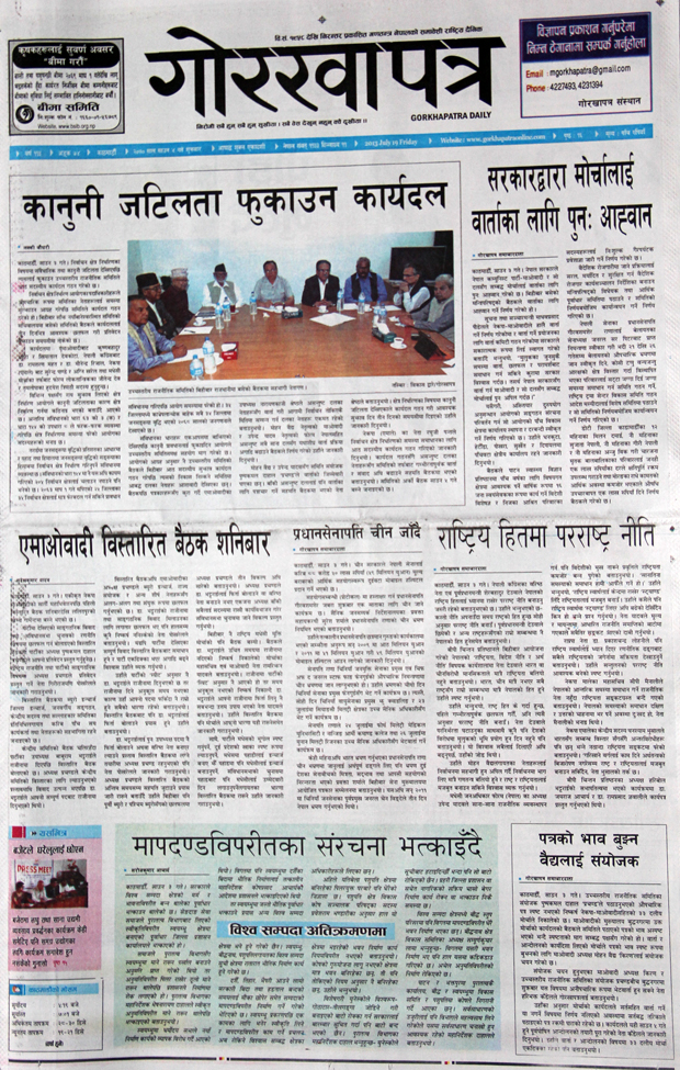 आज मिति २०७० साउन ४ गते शुक्रबार । राजधानीबाट प्रकाशित आजका दैनिक पत्रिकाले निर्वाचन क्षेत्र निर्धारणका लागि रहेका कानुनी जटिलता फुकाउन कार्यदल गठन गरिएको खबरलाई प्राथमिकताका साथ छापेका छन् ।