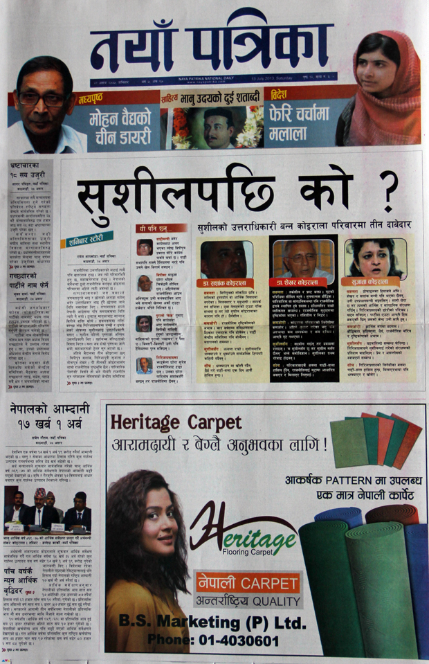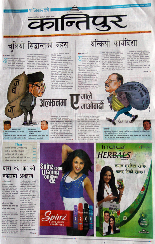 कान्तिपुर दैनिकले एमालेमा सिद्धान्तको बहस चुलिएको र एमाओवादीको कार्यदिशा थन्किएको खबरलाई मुख्य बनाएको छ । नयाँ पत्रिका दैनिकले सुशील कोइरालापछि काँग्रेसका तीन दाबेदार रहेको खबरलाई मुख्य बनाएको छ ।