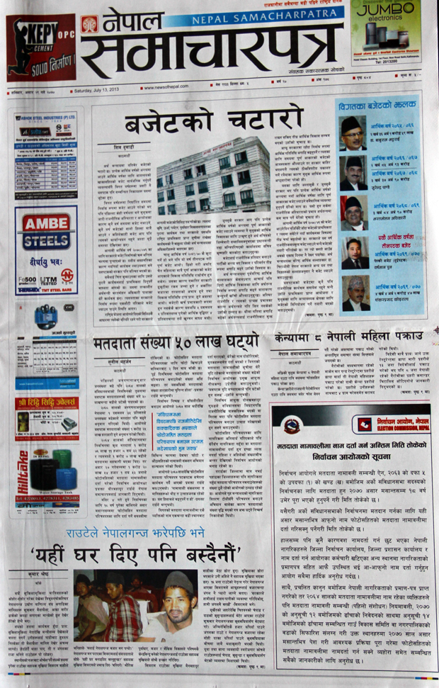 आज मिति २०७० असार २९ गते शनिबार । राजधानीबाट प्रकाशित आजका दैनिक पत्रिकाले सरकारलाई बजेट ल्याउने चटारो बढेको खबरलाई प्राथमिकताका साथ छापेका छन् ।