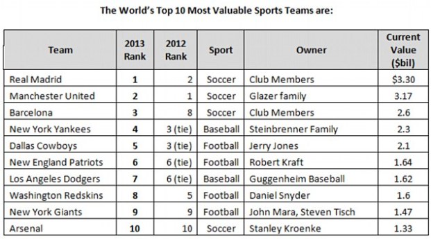 अघिल्लो वर्ष पहिलो स्थानमा रहेको म्यानचेष्टर युनाइटेड ३.१७ बिलियन डलरसहित दोस्रो स्थानमा छ । गत वर्ष आठौं स्थानमा रहेको स्पेनिस क्याटलन बार्सिलोना तेस्रो स्थानमा उक्लिएको छ । उसको हालको सम्पत्ति २.६ बिलियन डलर मूल्यांकन गरिएको छ । चौथो स्थानमा अमेरिकन बेसबल टिम न्यूयोर्क यानकेस छ । १.३३ बिलियन डलर सम्पत्ति मूल्यांकन भएको आर्सनल दशौं स्थानमा रहेको छ ।