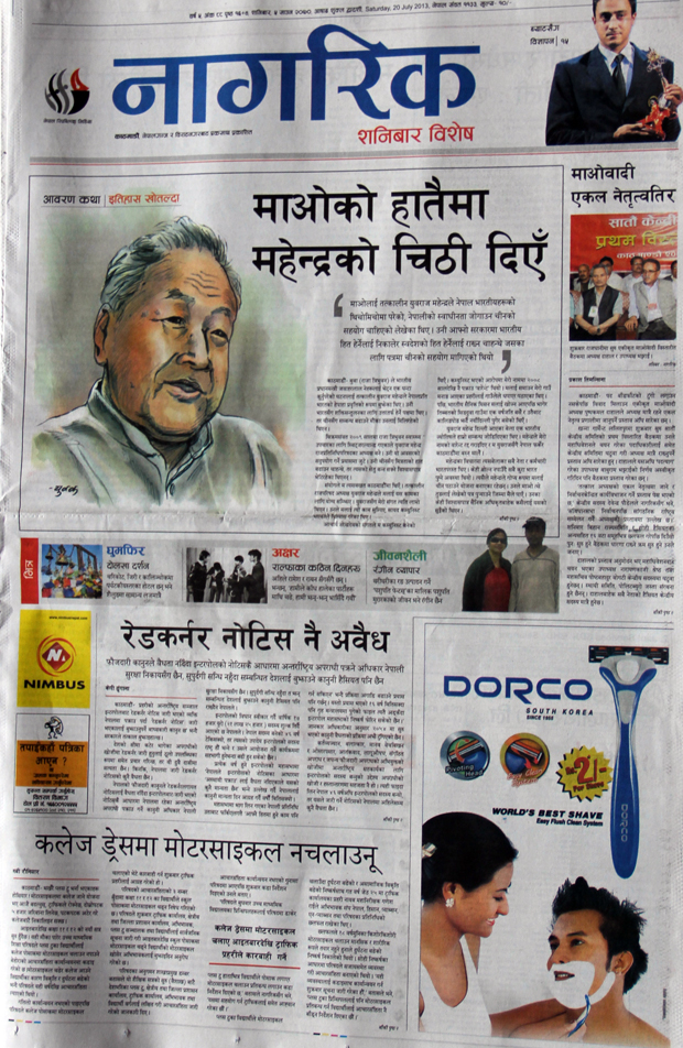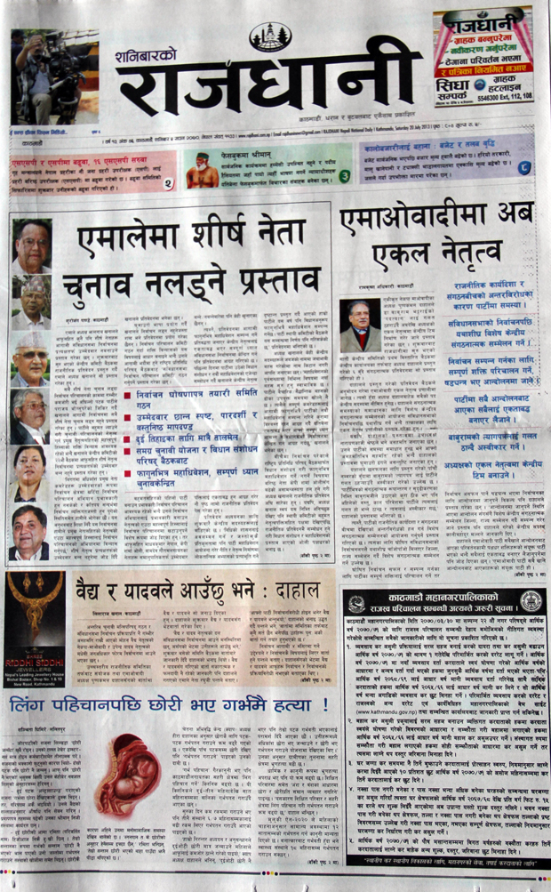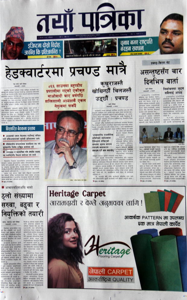 आज मिति २०७० साउन ५ गते शनिबार । राजधानीबाट आज प्रकाशित दैनिक पत्रिकाले एकीकृत नेकपा माओवादीको विस्तारित बैठकबाट पार्टी एकल नेतृत्व तर्फ गएको खबरलाई उच्च प्राथमिकताका साथ छापेका छन् ।